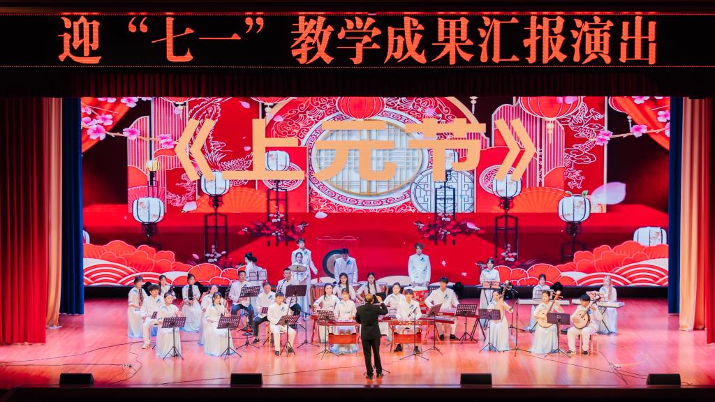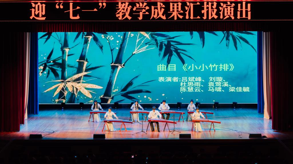 演出在民族管弦乐《红楼梦—序》《上元节》的悠扬旋律中拉开帷幕。整场晚会以“红色记忆永流传”“时代浪潮展风采”“同心共筑中国梦”三大篇章为主线,通过15个精品节目串联起党的百年奋斗史诗。女生小合唱《映山红》以深情歌声唤醒革命记忆,古筝合奏《绣金匾》用弦音传递人民对老一辈革命家的深切缅怀;舞蹈《远古的呼唤》与情景剧《满江红》则分别以跨越时空的艺术语言,展现中华文明的厚重底蕴和民族英雄的赤胆忠心。