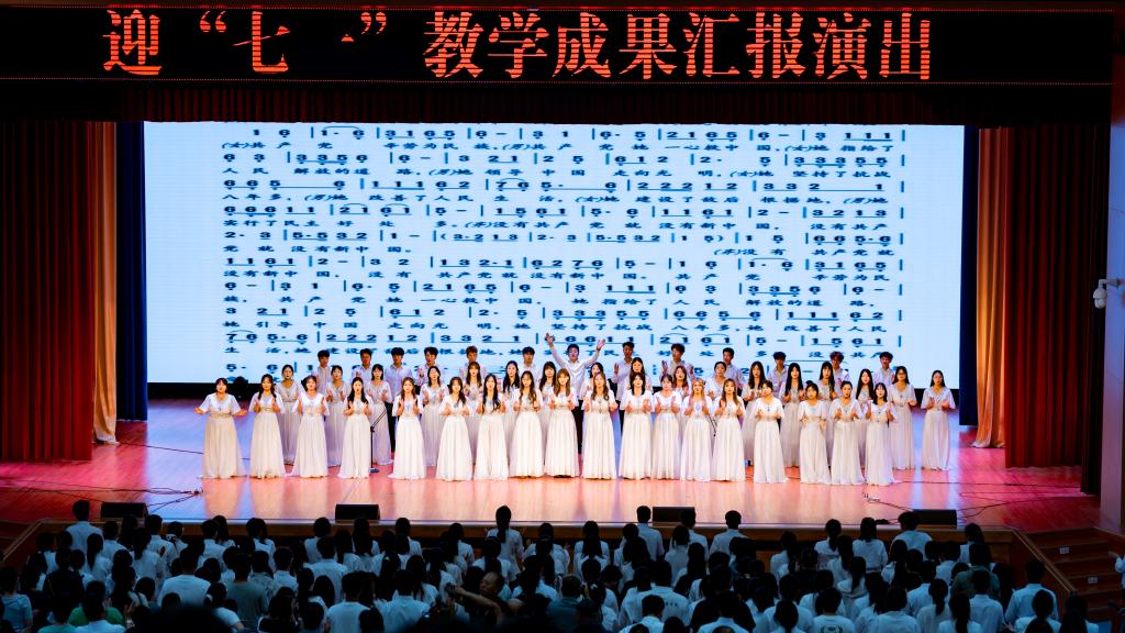 第二篇章以钢琴独奏《采茶扑蝶》、舞蹈《能不忆江南》展现改革开放以来的时代风貌;第三篇章通过蒙古舞《走在阳光下》、竹笛合奏《沂河欢歌》等节目,抒写民族团结与乡村振兴的壮美画卷。压轴节目《领航》与全场合唱《没有共产党就没有新中国》将晚会推向高潮,彰显师生永远跟党走的坚定信念。