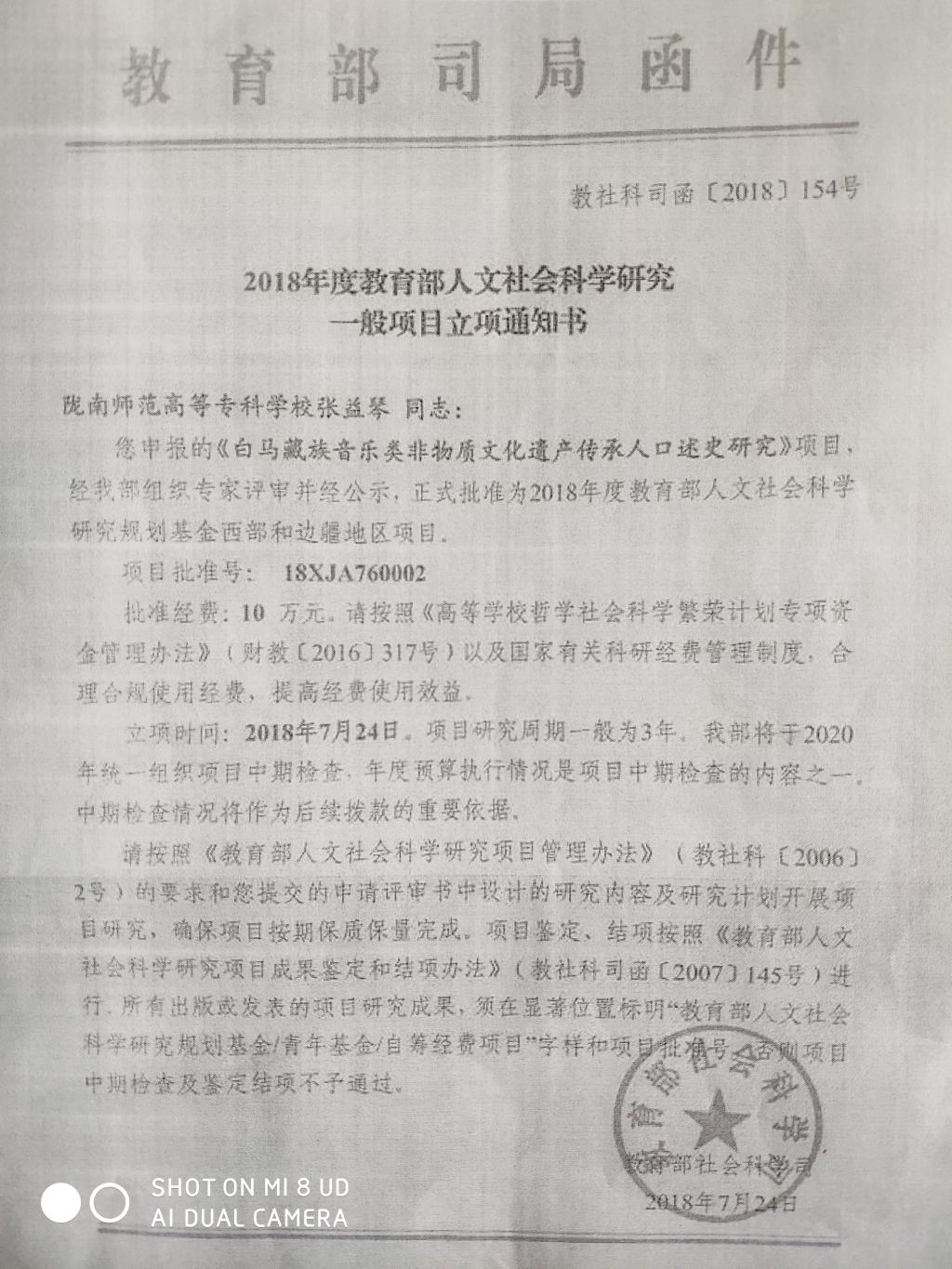 6月28日,2018年度教育部人文社会科学研究西部和边疆地区项目评审结果公示,公司bevictor1946韦德官网教授张益琴申报的《白马藏族音乐类非物质文化遗产传承人口述史研究》获得规划基金项目立项,这是公司首次获得教育部科研项目。该项目获批资助10万元,2021年结项。
