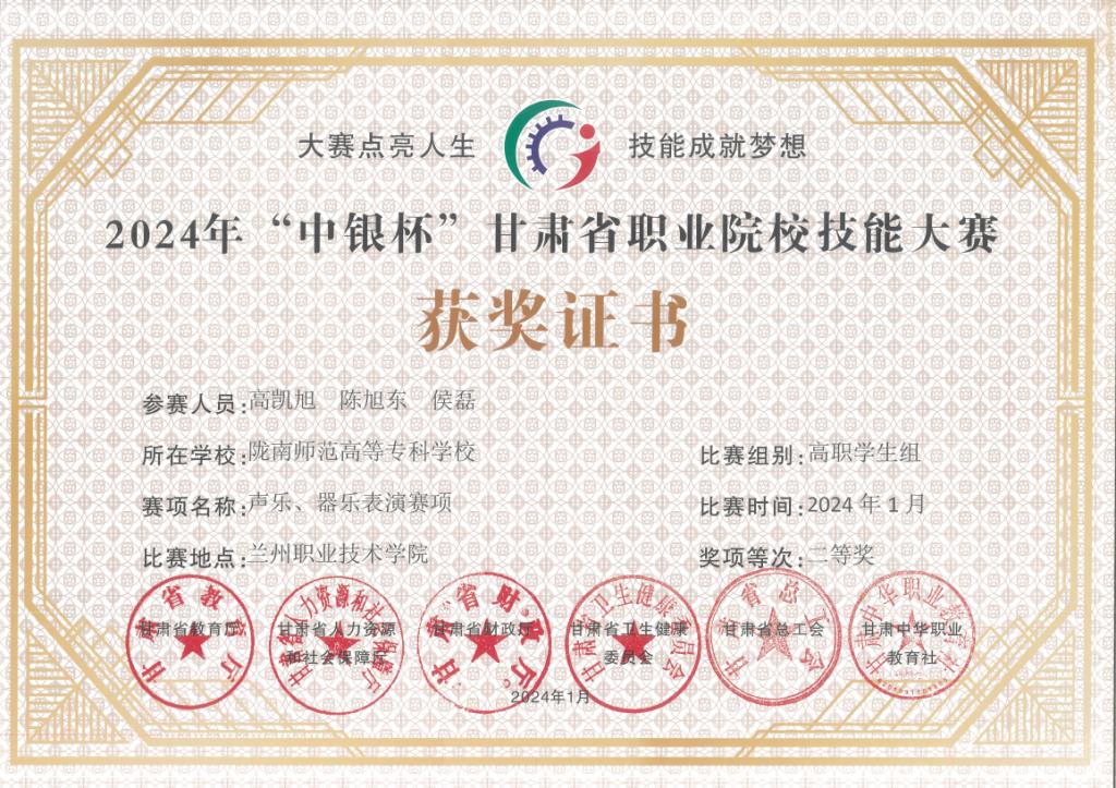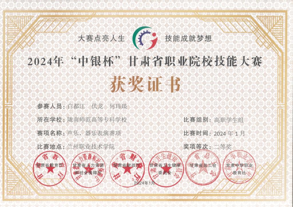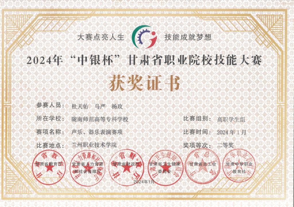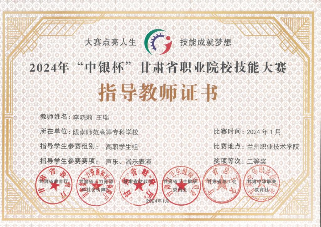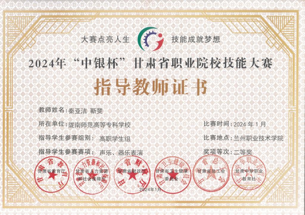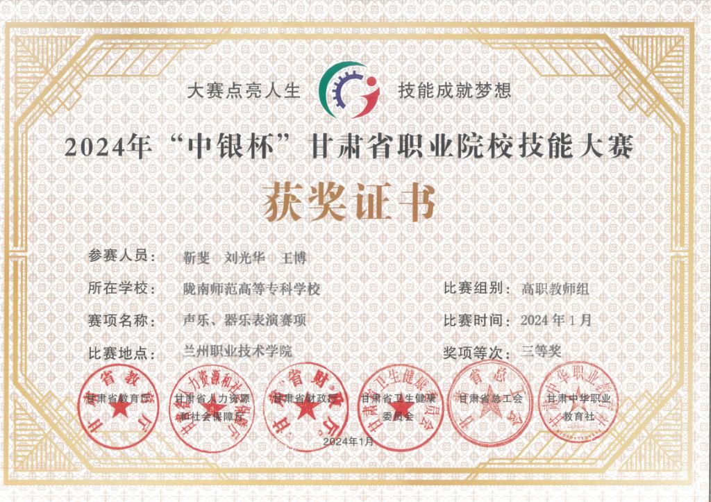 年甘肃省职业院校技能大赛声乐、器乐表演赛项活动中,全部获奖,其中教师组一等奖
